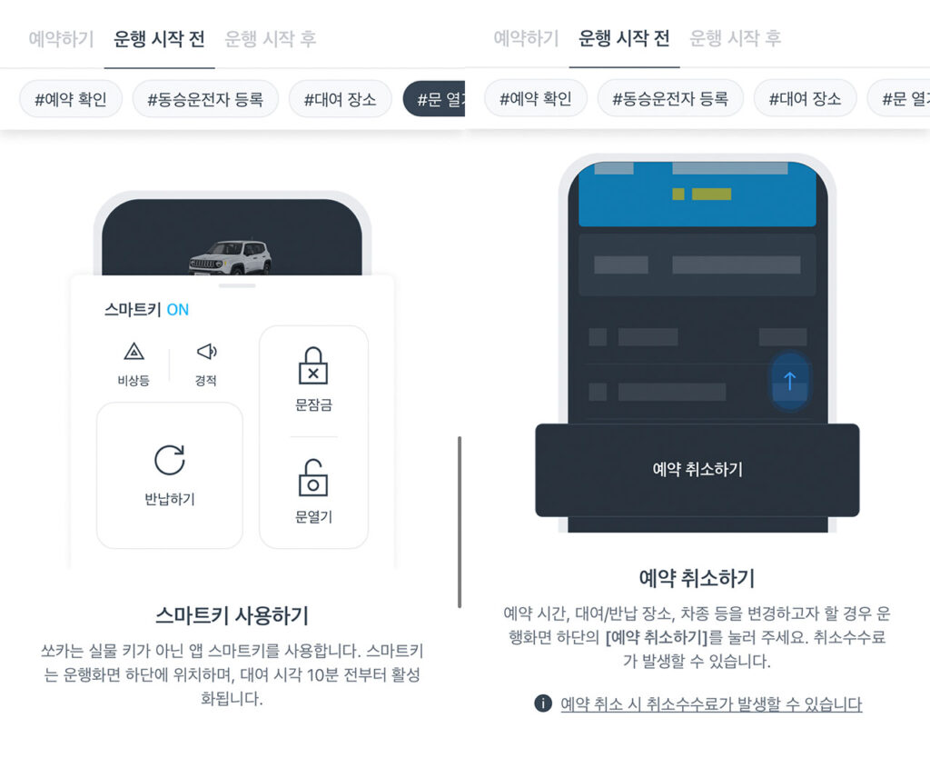 - 예약 변경/취소: 대여 시작 1시간 전까지는 무료로 예약 변경이나 취소가 가능합니다.