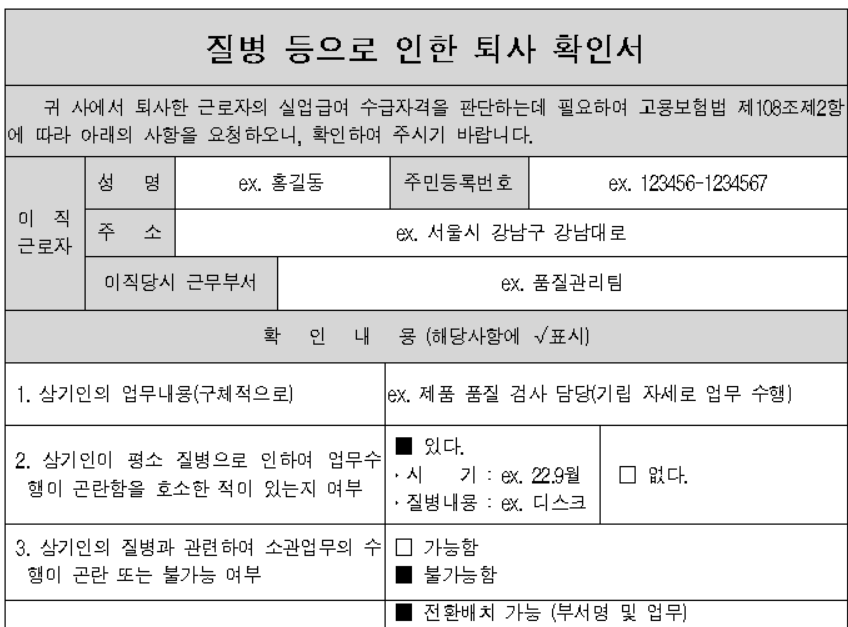 • 사업장 확인서: 회사에서 발급하는 이 서류는 내부규정에 따라 병가 신청이 불가하고 직무이동이 어려움을 증명합니다.