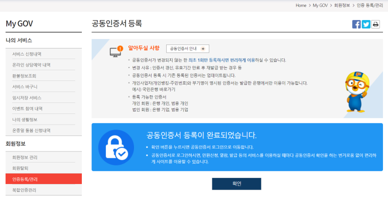 - 공용 PC에서 사용 후에는 반드시 로그아웃하고 인증서를 삭제하세요.