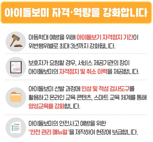 A8. 아이돌보미는 엄격한 신원조회와 건강검진을 거친 후, 80시간 이상의 전문 양성교육을 이수한 분들입니다. 정기적인 보수교육도 받고 있어 안심하고 맡기실 수 있어요.